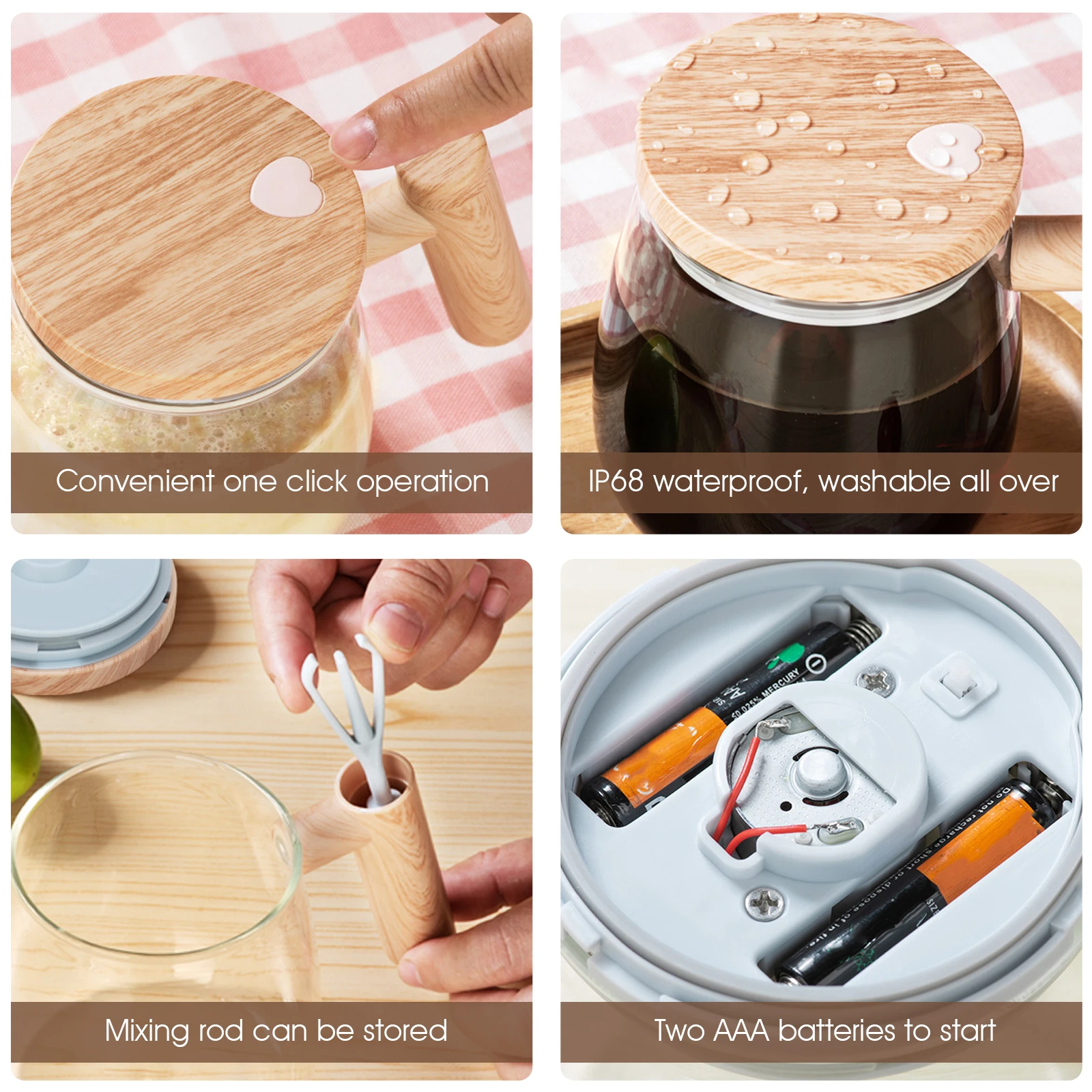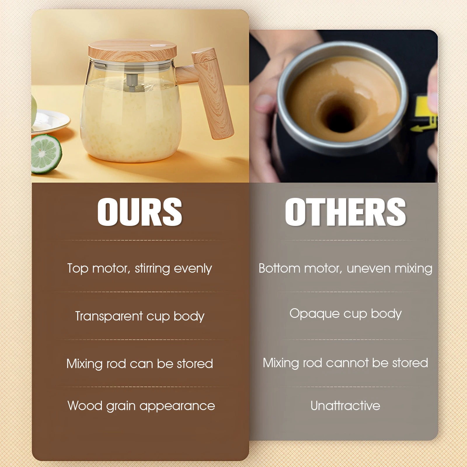 [Handle with Storage Function] This electric stirring mug is designed with a handle of which top has a stirring stick storage design. Easy to store stirring stick, no need to worry about easily lose. Wooden grain handle and lid that is stylish and comfortable to grip.
